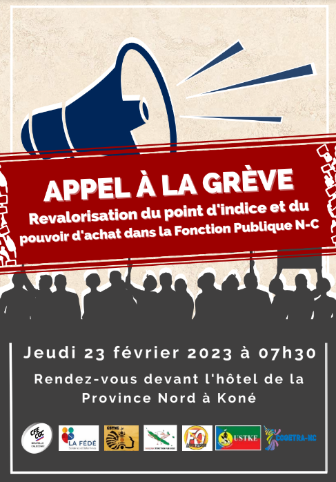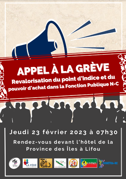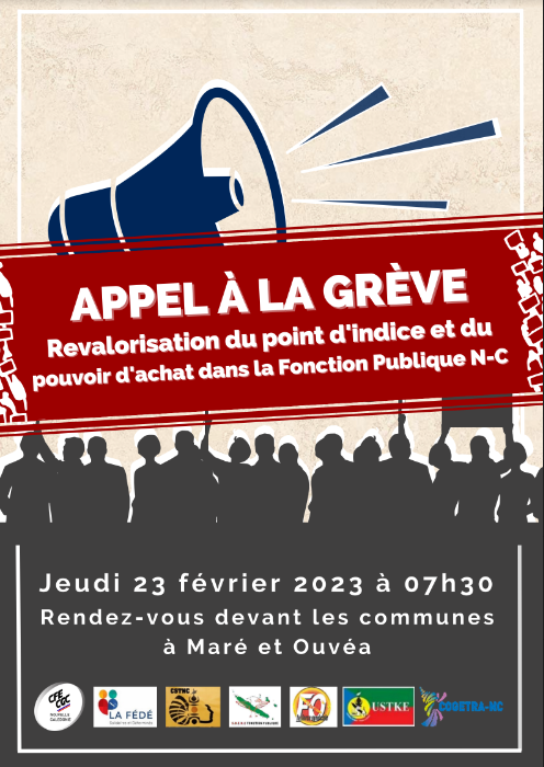 Appel à la grève pour tous les fonctionnaires de la Fonction Publique de N-C en une intersyndicale réunissant tous les syndicats représentatifs de la Nouvelle-Calédonie accompagnée d’une marche dans les rues de Nouméa le jeudi 23 février 2023.